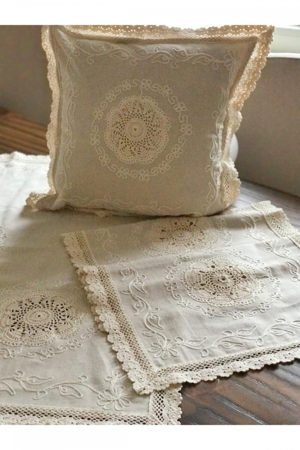 Keten El Danteli Kırlent Kılıfı Krem